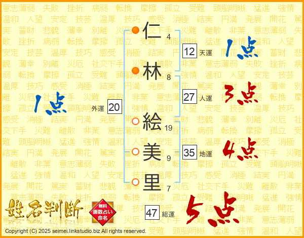 仁(4画)林(8画) 絵(19画)美(9画)里(7画)