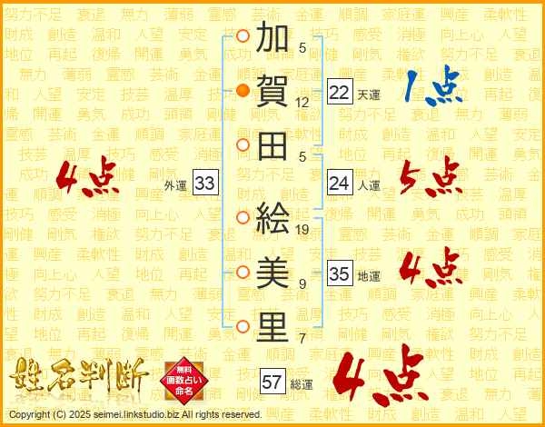 加(5画)賀(12画)田(5画) 絵(19画)美(9画)里(7画)