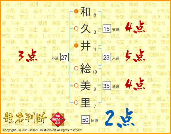 和(8画)久(3画)井(4画) 絵(19画)美(9画)里(7画)