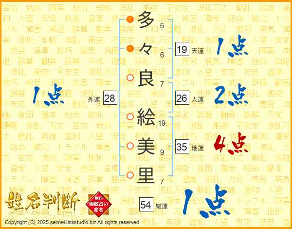 多(6画)々(6画)良(7画) 絵(19画)美(9画)里(7画)