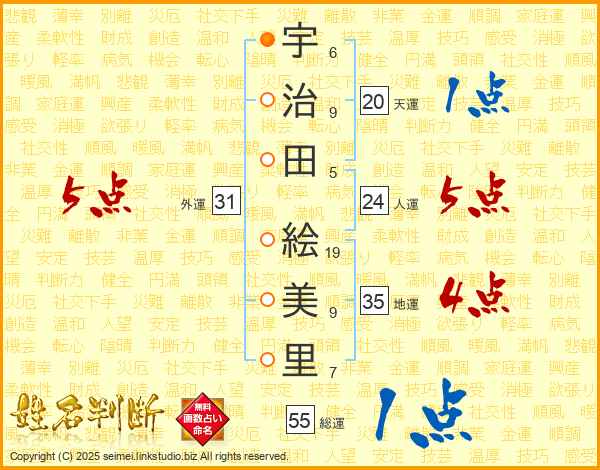 宇(6画)治(9画)田(5画) 絵(19画)美(9画)里(7画)