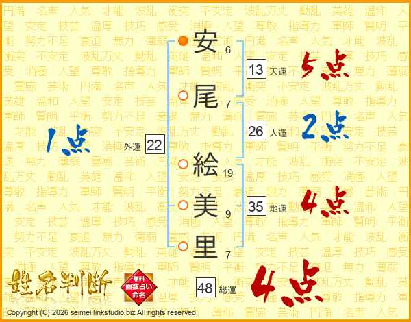 安(6画)尾(7画) 絵(19画)美(9画)里(7画)