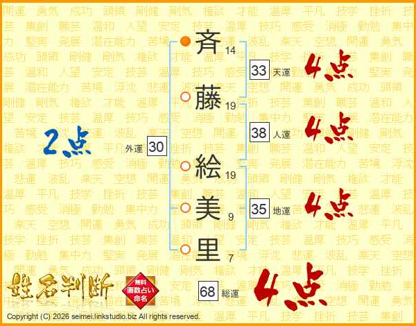 斉(14画)藤(19画) 絵(19画)美(9画)里(7画)
