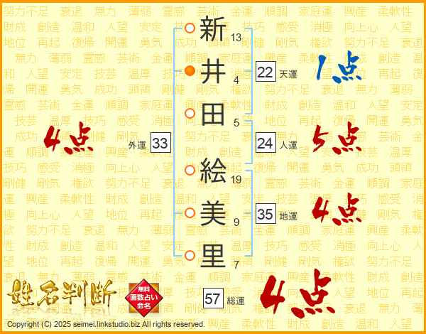 新(13画)井(4画)田(5画) 絵(19画)美(9画)里(7画)