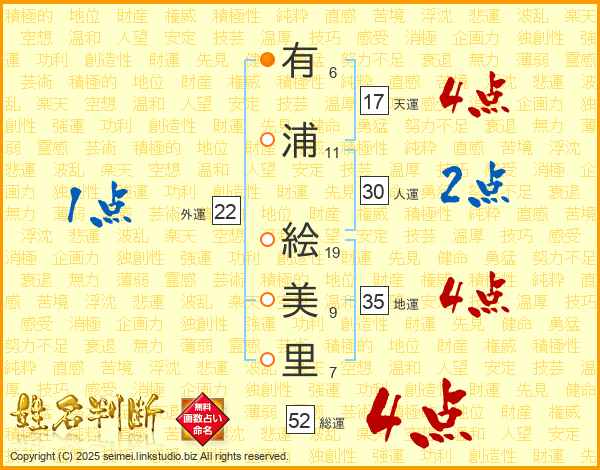 有(6画)浦(11画) 絵(19画)美(9画)里(7画)