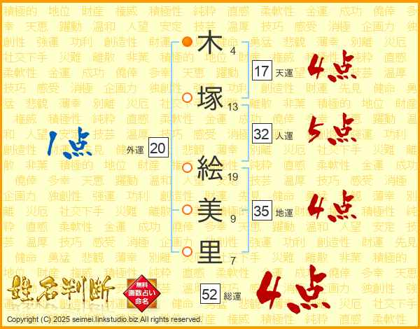 木(4画)塚(13画) 絵(19画)美(9画)里(7画)