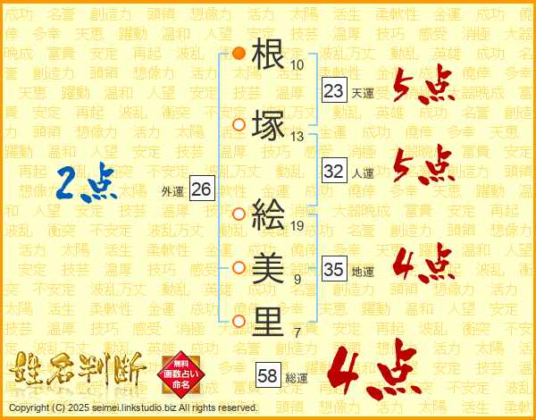 根(10画)塚(13画) 絵(19画)美(9画)里(7画)