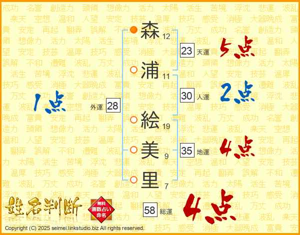 森(12画)浦(11画)  絵(19画)美(9画)里(7画)