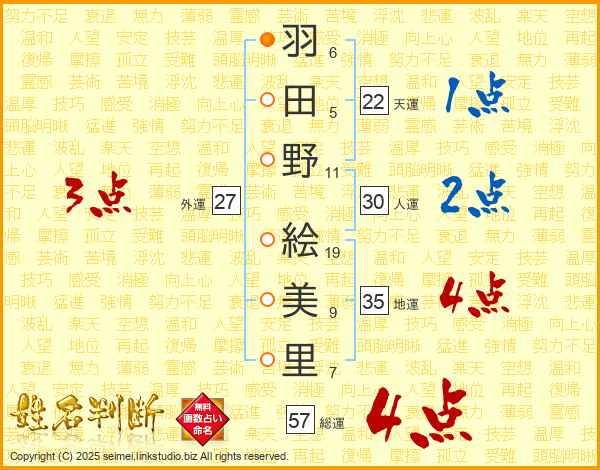 羽田野絵美里さんの総運は57画の4点!