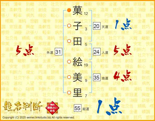 菓(12画)子(3画)田(5画) 絵(19画)美(9画)里(7画)