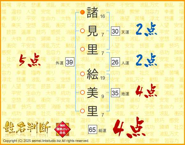 諸(16画)見(7画)里(7画)  絵(19画)美(9画)里(7画)