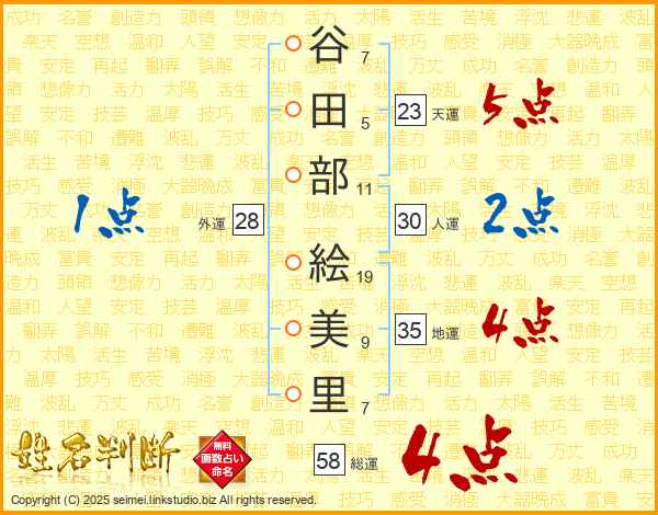 谷(7画)田(5画)部(11画)  絵(19画)美(9画)里(7画)