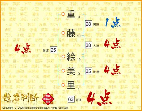 重(9画)藤(19画) 絵(19画)美(9画)里(7画)