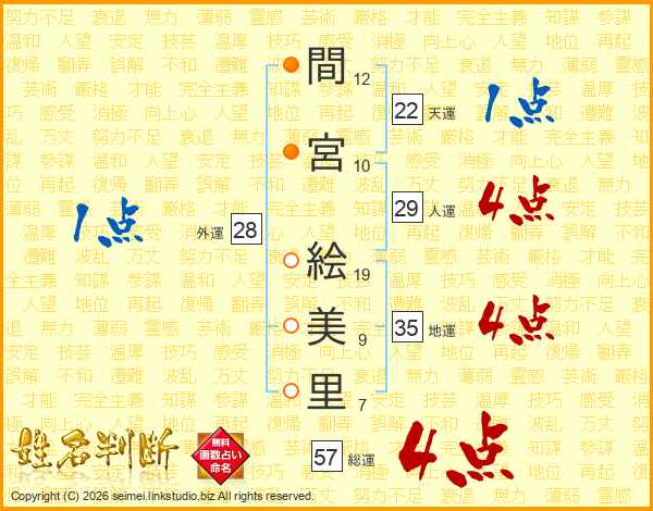 間宮絵美里さんの総運は57画の4点!