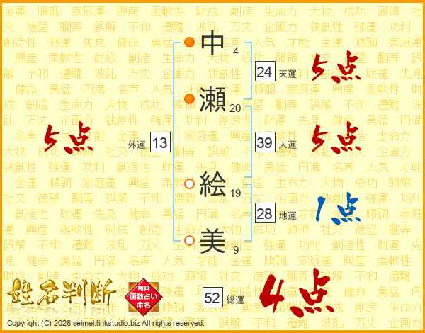 中瀬絵美さんの人運は39画の5点!