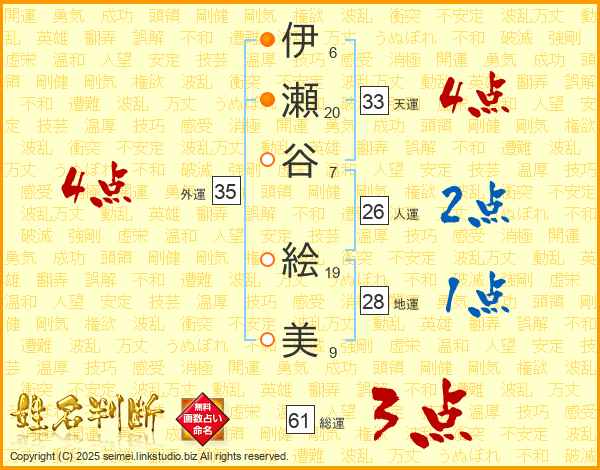 伊(6画)瀬(20画)谷(7画) 絵(19画)美(9画)