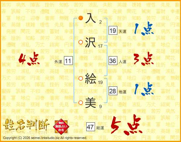 生活面を象徴する運勢です。外部から受ける影響力を表し、結婚運、家庭運や職場、環境への順応性を表します。総運から人運を引いた画数。姓や名が1文字の場合を除く。