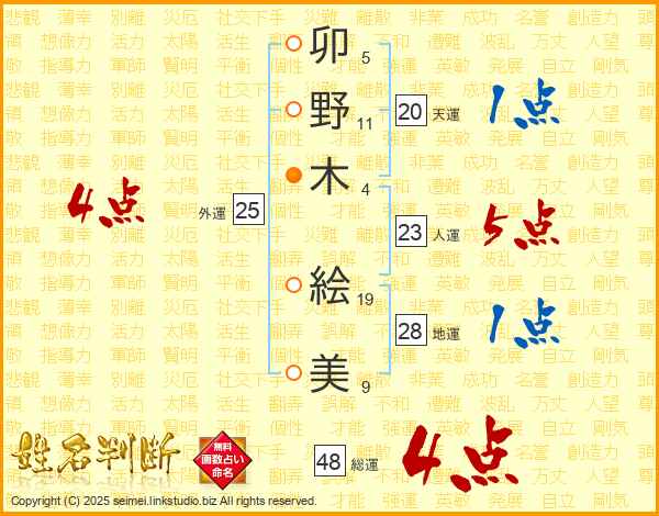 卯(5画)野(11画)木(4画) 絵(19画)美(9画)
