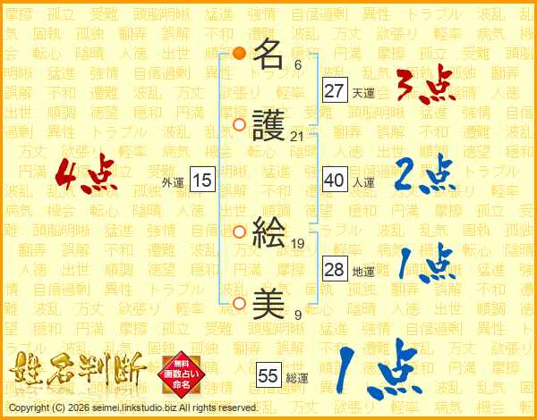 生活面を象徴する運勢です。外部から受ける影響力を表し、結婚運、家庭運や職場、環境への順応性を表します。総運から人運を引いた画数。姓や名が1文字の場合を除く。