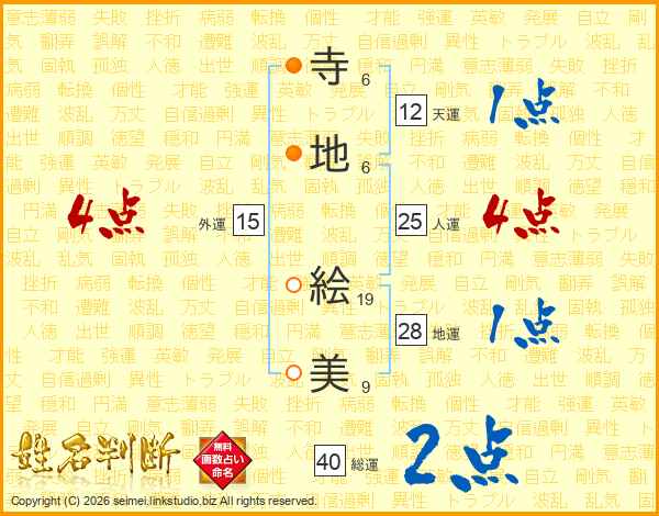 寺(6画)地(6画) 絵(19画)美(9画)