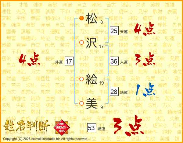 生活面を象徴する運勢です。外部から受ける影響力を表し、結婚運、家庭運や職場、環境への順応性を表します。総運から人運を引いた画数。姓や名が1文字の場合を除く。