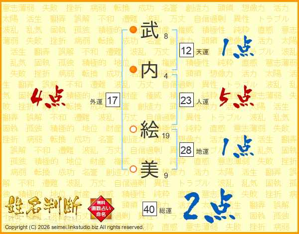 武(8画)内(4画) 絵(19画)美(9画)