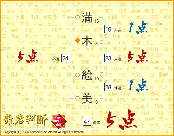 満(15画)木(4画) 絵(19画)美(9画)