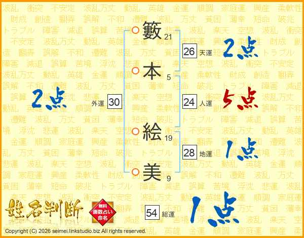 生活面を象徴する運勢です。外部から受ける影響力を表し、結婚運、家庭運や職場、環境への順応性を表します。総運から人運を引いた画数。姓や名が1文字の場合を除く。