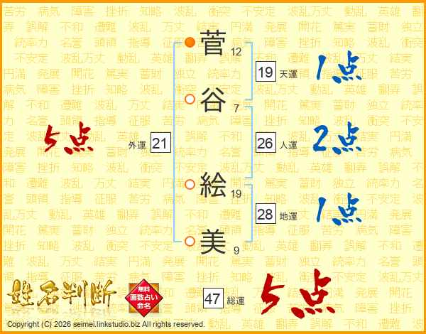 菅(12画)谷(7画) 絵(19画)美(9画)