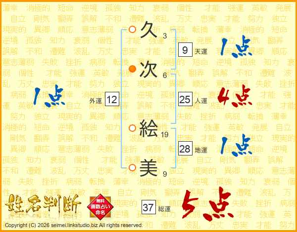 生活面を象徴する運勢です。外部から受ける影響力を表し、結婚運、家庭運や職場、環境への順応性を表します。総運から人運を引いた画数。姓や名が1文字の場合を除く。