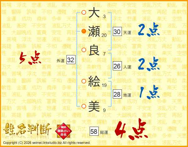 大(3画)瀬(20画)良(7画) 絵(19画)美(9画)