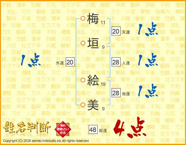 梅(11画)垣(9画) 絵(19画)美(9画)
