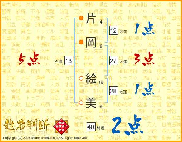 生活面を象徴する運勢です。外部から受ける影響力を表し、結婚運、家庭運や職場、環境への順応性を表します。総運から人運を引いた画数。姓や名が1文字の場合を除く。