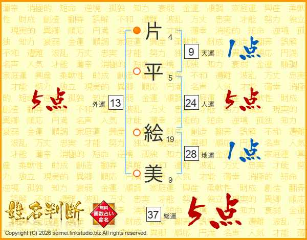 生活面を象徴する運勢です。外部から受ける影響力を表し、結婚運、家庭運や職場、環境への順応性を表します。総運から人運を引いた画数。姓や名が1文字の場合を除く。