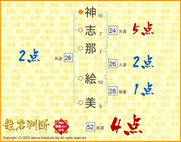 神(10画)志(7画)那(7画) 絵(19画)美(9画)