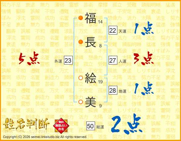 生活面を象徴する運勢です。外部から受ける影響力を表し、結婚運、家庭運や職場、環境への順応性を表します。総運から人運を引いた画数。姓や名が1文字の場合を除く。