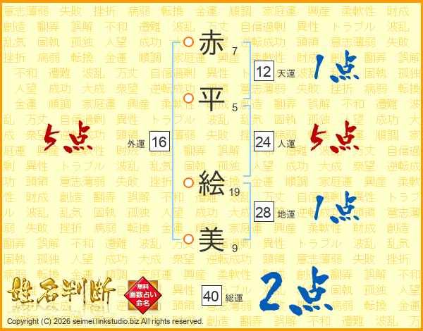 画数の奇数(○陽)と偶数(●陰)の配列で吉凶を占います。どちらかにかたよる名前は大凶名で避ける必要があります。画数の奇数偶数。