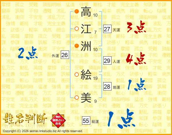 高(10画)江(7画)洲(10画) 絵(19画)美(9画)