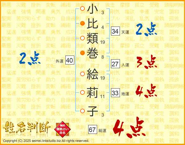 小(3画)比(4画)類(19画)巻(8画) 絵(19画)莉(11画)子(3画)