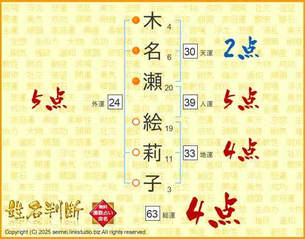 木(4画)名(6画)瀬(20画) 絵(19画)莉(11画)子(3画)