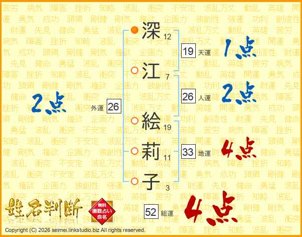 深(12画)江(7画) 絵(19画)莉(11画)子(3画)