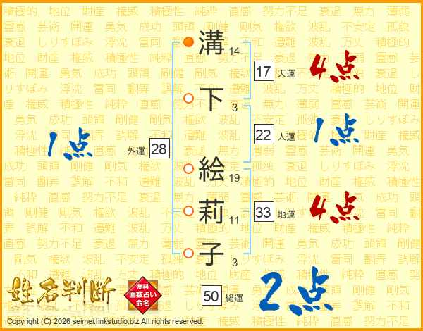 溝(14画)下(3画) 絵(19画)莉(11画)子(3画)