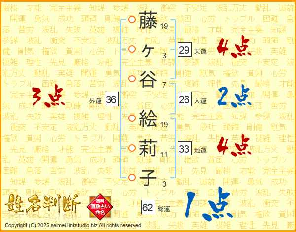 藤(19画)ヶ(3画)谷(7画) 絵(19画)莉(11画)子(3画)