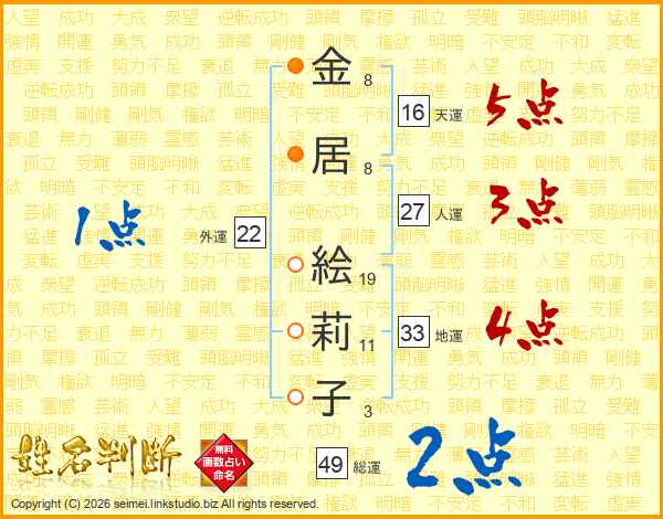 金(8画)居(8画) 絵(19画)莉(11画)子(3画)