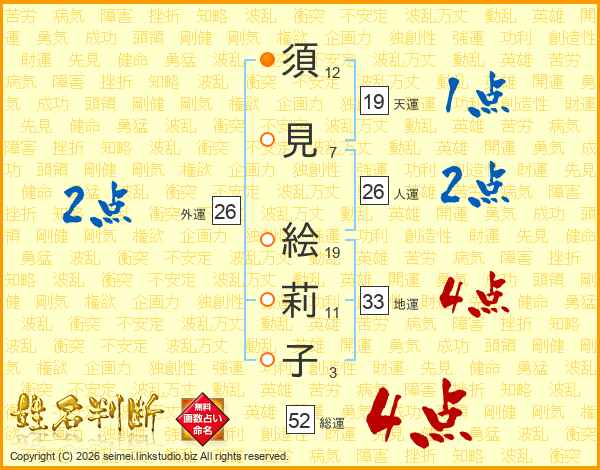 須(12画)見(7画) 絵(19画)莉(11画)子(3画)