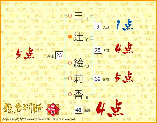 三(3画)辻(6画) 絵(19画)莉(11画)香(9画)