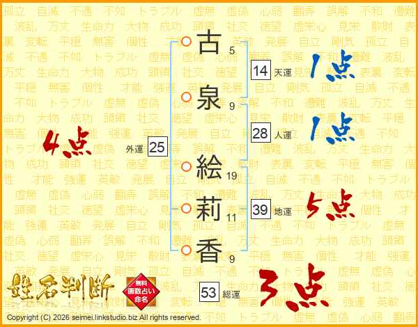 古(5画)泉(9画) 絵(19画)莉(11画)香(9画)