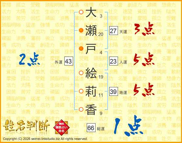 大(3画)瀬(20画)戸(4画) 絵(19画)莉(11画)香(9画)