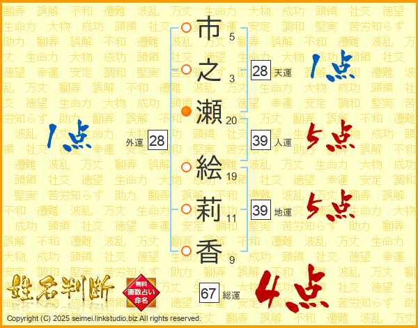 市(5画)之(3画)瀬(20画) 絵(19画)莉(11画)香(9画)