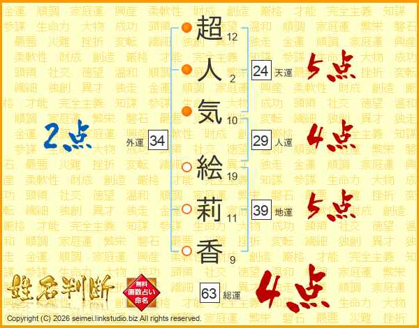 超(12画)人(2画)気(10画) 絵(19画)莉(11画)香(9画)